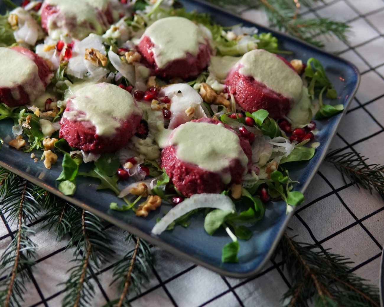 Flan alla rapa rossa con crema al Parmigiano, basilico e yogurt con insalatina della buona sorte