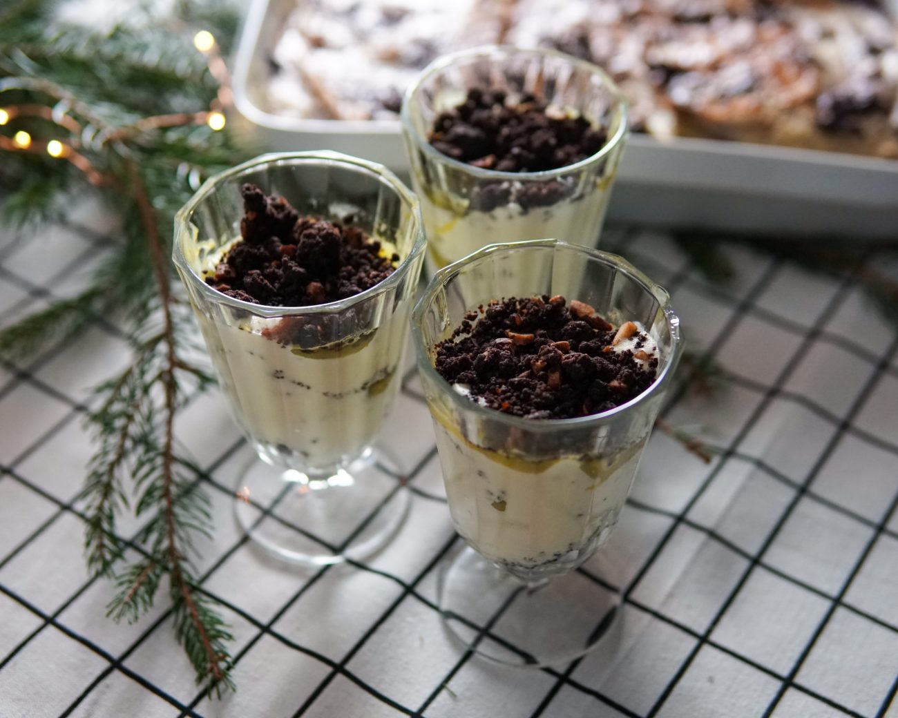 Bicchierini al mascarpone, crema all’arancia e crumble di cacao e mandorle