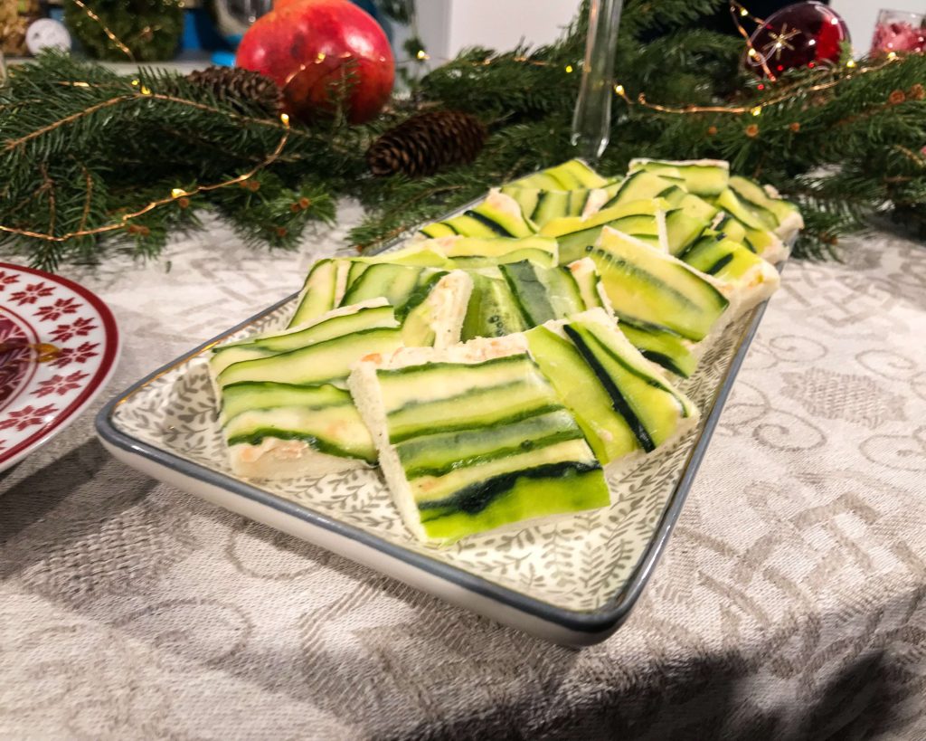 TRAMEZZINI AL CETRIOLO CON ROBIOLA E SALMONELavate i cetrioli e togliete le due estremità. Usando un pelapatate, eliminate 4 strisce di buccia da ciascun cetriolo, procedendo sui 4 lati. In una ciotolina mescolate insieme il burro morbido, la robiola, il salmone tritato a coltello e il sale. Spalmate questa crema sulle fette di pane e poi usate le strisce di cetriolo per coprire ciascuna fetta. Lasciate sbordare le estremità. Taglia il pane in quadrotti per formare delle tartine. |