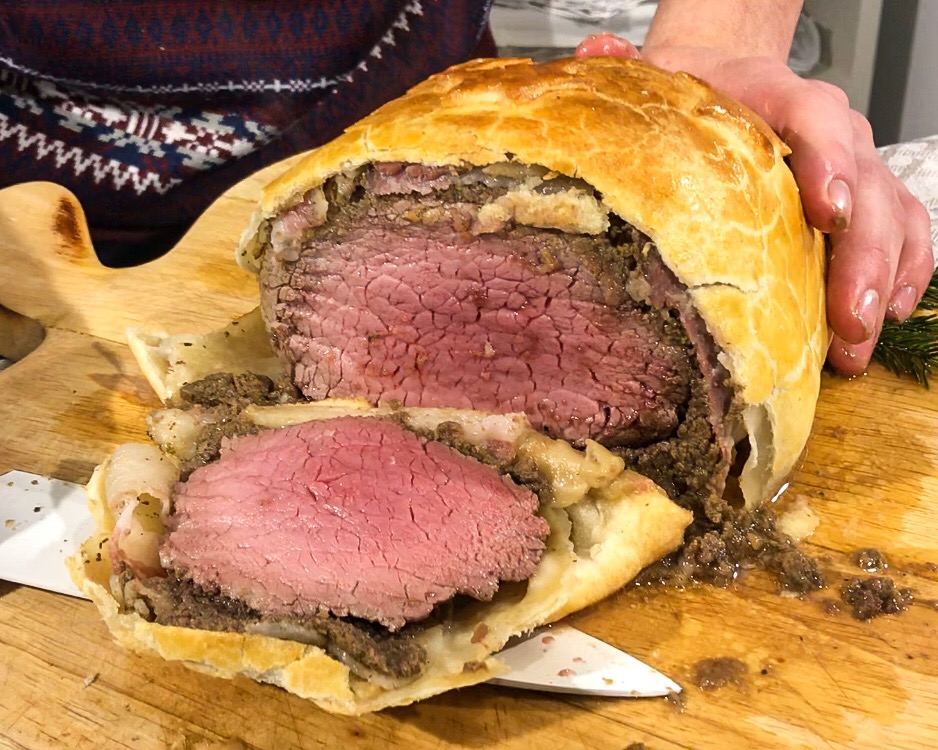 FILETTO DI MANZO ALLA WELLINGTONMassaggiate la carne (che non dev’essere fredda di frigorifero) con sale e pepe. Frullate i funghi assieme a un filo di olio, a del sale e a del pepe. Stendete sul piano da lavoro della pellicola e adagiatevi sopra delle fette di prosciutto crudo in modo da formare un rettangolo e copritele con la crema di funghi spalmandola con il dorso di un cucchiaio. Disponete, infine, il filetto di manzo al centro. Aiutandovi con la pellicola avvolgete la carne con i funghi e il lardo pancettato. Trasferite il filetto su una teglia ricoperta di carta forno. Spennellate la pasta sfoglia con il tuorlo sbattuto e, con la punta di un coltellino affilato, praticate delle incisioni perpendicolari. Cuocete nel forno già caldo a 200° per 30 minuti. Sfornate il filetto, lasciatelo riposare per non più di 2 minuti e poi tagliatelo a fette spesse. |